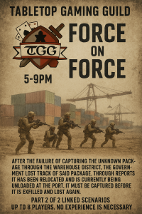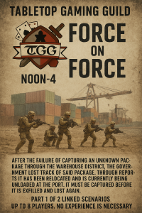 - 5 PM – 9 PM: Miniature game: Force on Force Part 2
